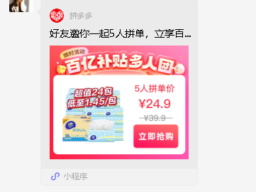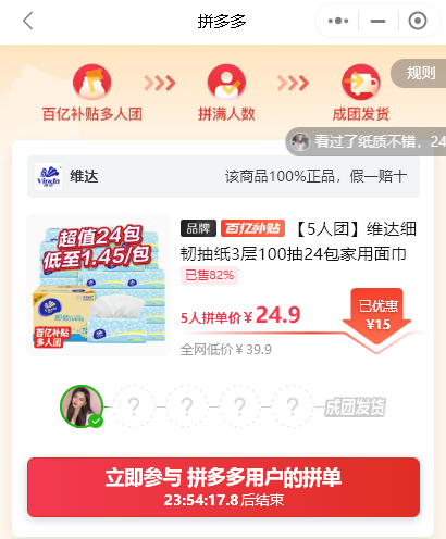 注意,需要在你下单之后将拼团链接发送给自己的其他人,好友通过拼团链接下单之后就视为参团成功。注意,百亿补贴拼团活动的有效期是24小时,在24小时之内拼团成功就会自动发货,如果不满足拼团条件,那么就会自动退款。