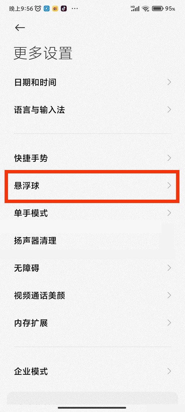 2、点击【悬浮球】选项。