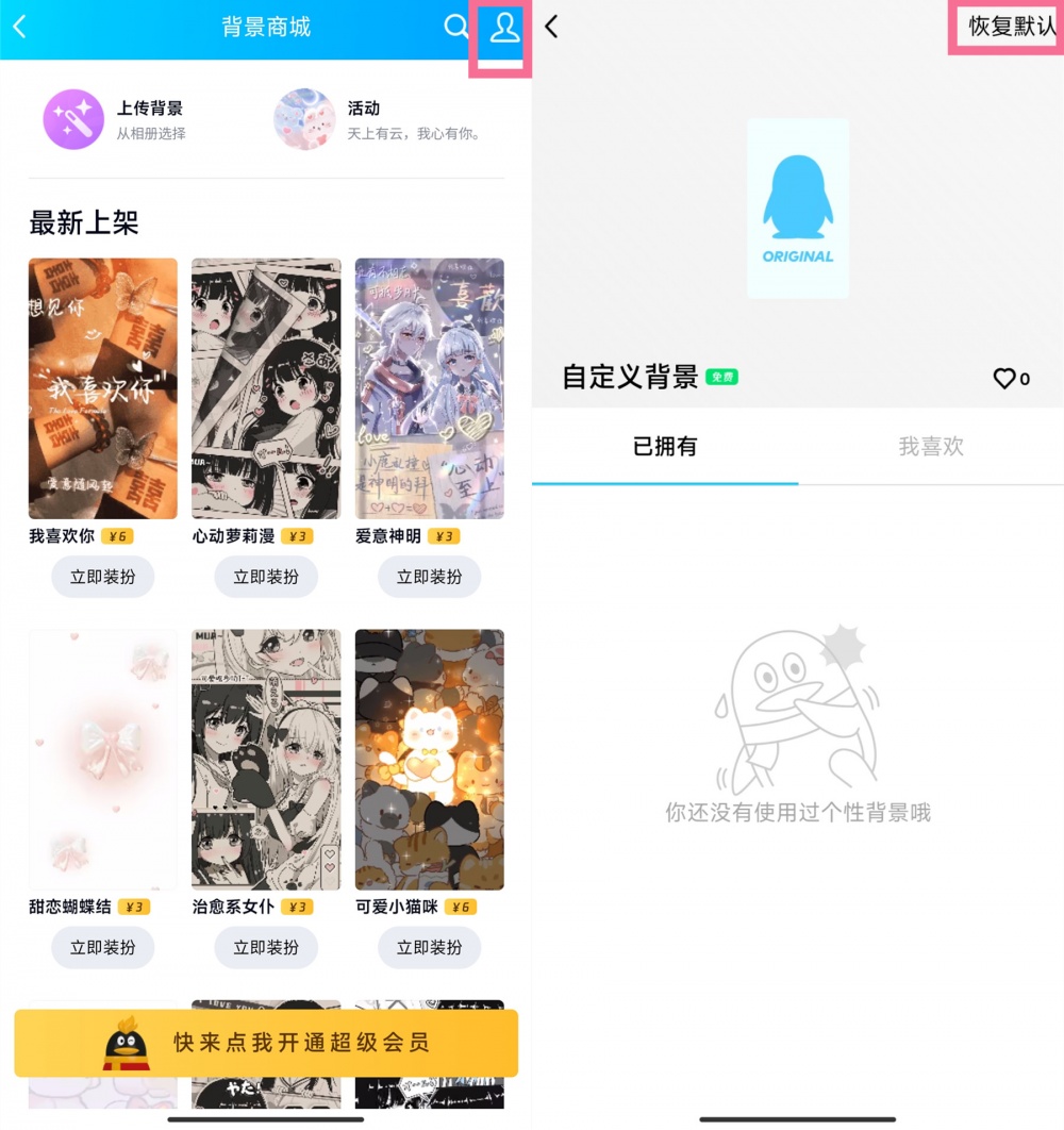 3、点击右上角人像图标,进入后点击【恢复默认】即可。