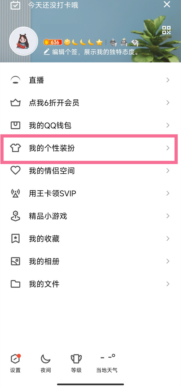 1、打开手机QQ,点击左上角的个人头像,点击【我的个性装扮】。
