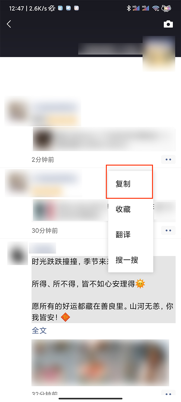 一键复制朋友圈转发只能复制朋友圈文字,无法复制图片,复制朋友圈转发操作如下: