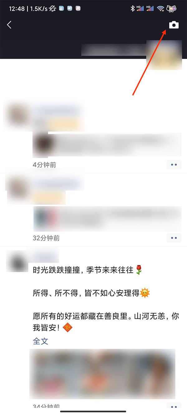 3、长按右上角相机图标进入到发表文字的页面。