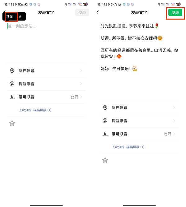 4、长按文字编辑区域,点击粘贴,点击发表即可。