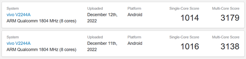 近日,vivo S16 标准版(V2244A)出现在了 Geekbench 跑分中,单核跑分 1014/1016,多核跑分 3179/3138。
