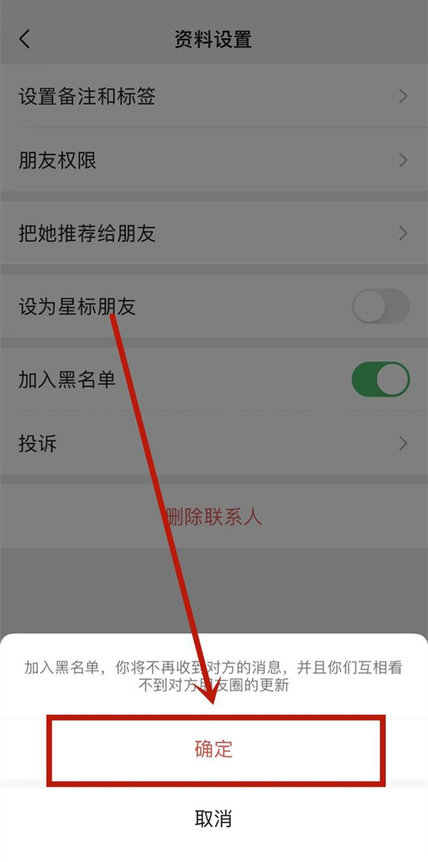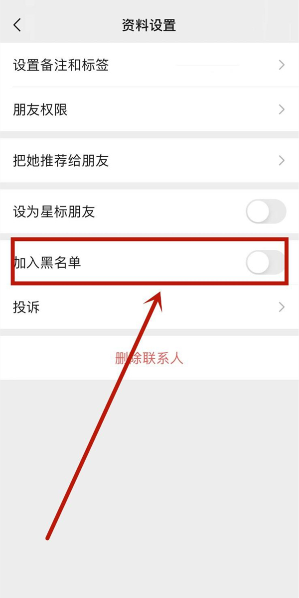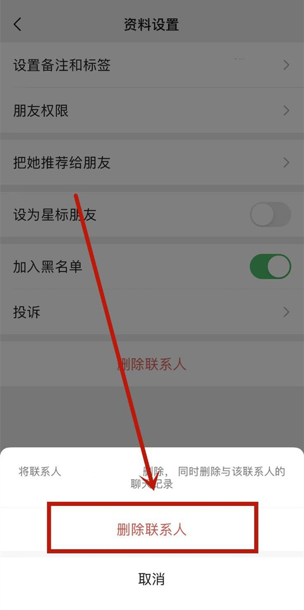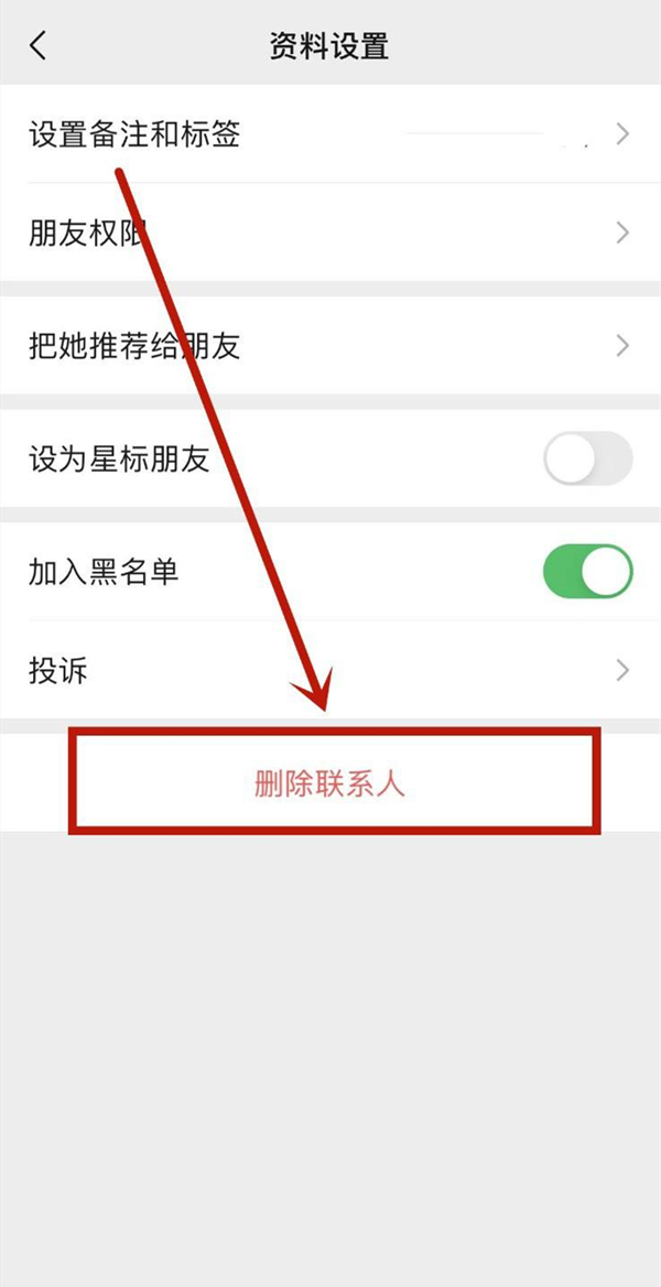 6、进入页面后,点击删除联系人即可完成拉黑删除且不可再次添加自己。