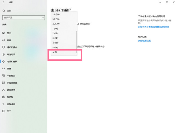 3、在睡眠时间一栏下,选择从不即可。