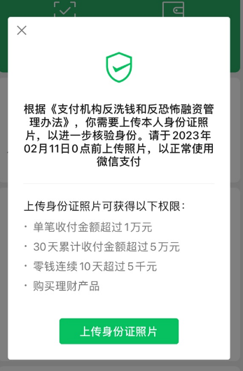 使用微信时,突然被提示要上传身份证照片,主要是因为腾讯响应国家相关法律法规、升级了微信支付账户的安全保障。