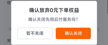 进入先用后付设置页面,这里会显示当前先用后付的状态。点击“关闭先用后付”按钮,系统会弹出确认提示框,提醒关闭该功能后将无法继续使用,且已产生的先用后付订单需按时还款。仔细阅读提示内容后,若确认关闭,点击“确认关闭”。